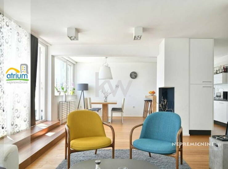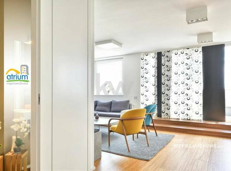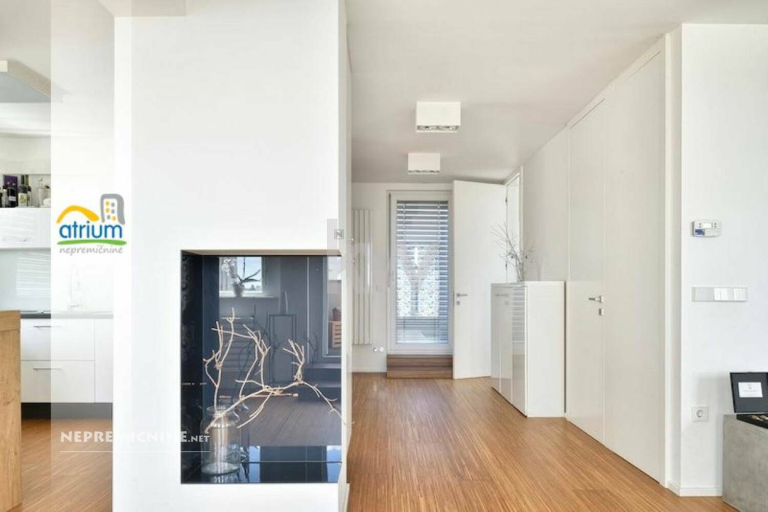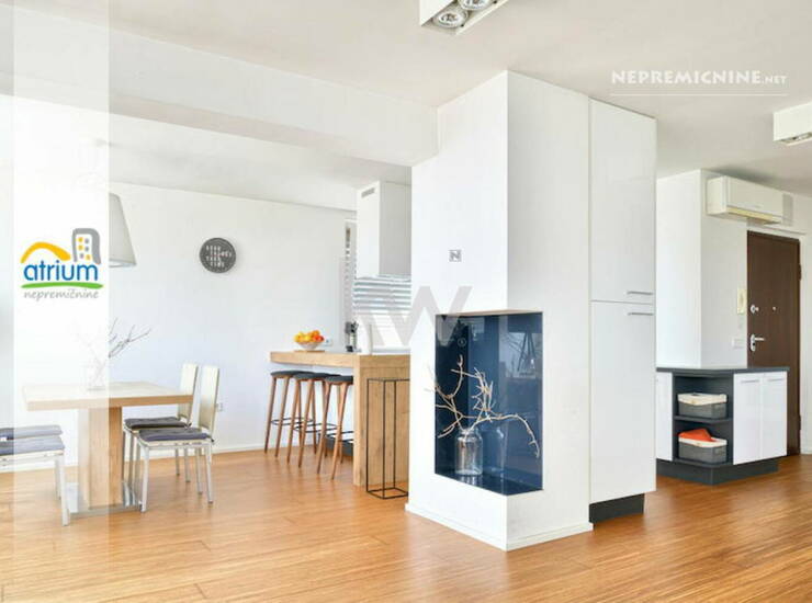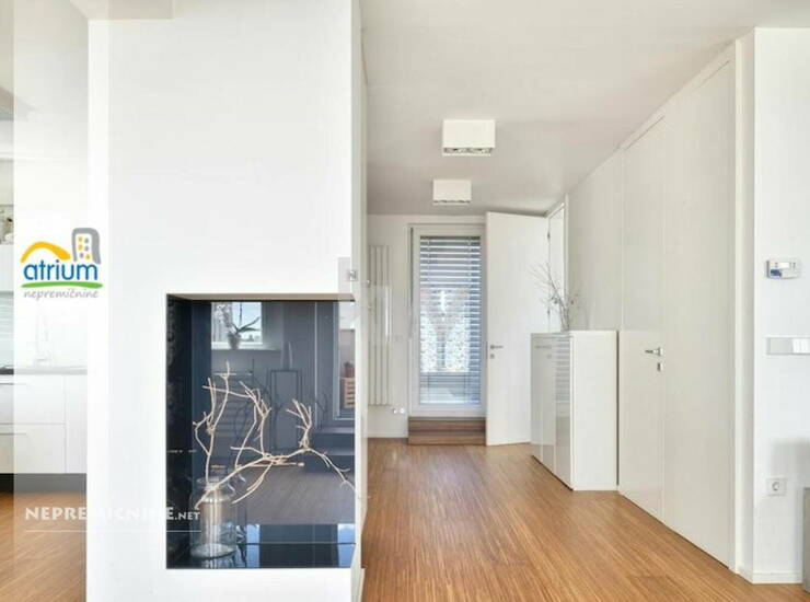 Vhod v stanovanje je v neposredni bližini dvigala. Ob vstopu v stanovanje vas pričaka garderobni del z balkonom za goste, ki povezuje prehod na veliko teraso nad stanovanjem, ter WC za goste. Nato se stanovanje odpira v dnevni prostor s prostorom za kamin in dnevnim balkonom, ki je povezan z jedilnico ter kuhinjo.