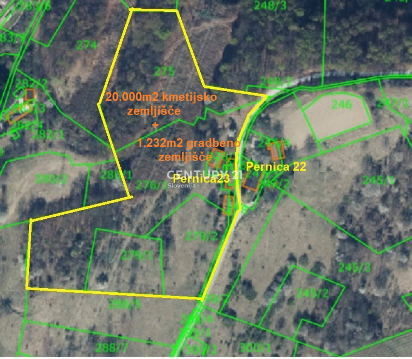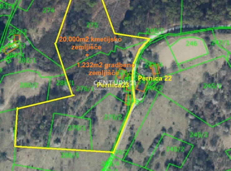 PERNICA : Zazidljiva parcela 1.231m2 + bonus 20.000m2 kmetijsko zemljišče Posredujemo pri prodaji zazidalne parcele 1.231 m2, pretežno položna lega in dodatno 20.000m2 kmetijskega zemljišča (travnik, sadovnjak, gozd) . Na gradbeni parceli se nahajajo 3-je objekti: kmečka hiša s hišno številko v izmeri 140m2 (priključek na elektriko, vodovod) ter dve kmetijski poslopji -, vsi letnik 1838( podatki GURS), so v slabem stanju, tako da je najbolj verjetna izbira rušitev. Objekti sicer niso spomeniško zaščiteni. Celotno stavbno področje, ki obsega 1.231m2 ima namensko rabo opredeljeno: površine razpršene poselitve. Stavbe se nahajajo na vrhu hriba s prekrasnim razgledom na gričevnato okolico in Pohorje. Področje na vrhu hriba, kjer stojijo objekti , je delno položno, sicer je rahel naklon tam, kjer se potem razprostira kmetijsko zemljišče na 20.000m2. Kmetijsko zemljišče v naravi predstavlja travnik, gozd in sadovnjak. Do posesti vodi občinska cesta, javna infrastruktura je v bližini - center Pernice je oddaljen ca.1,5 km. Hiter dostop do AC priključka (ca. 3 min vožnje). Zaradi daljnovoda, ki poteka nad delom posesti, kjer je kmetijsko zemljišče, je cena sedaj tako zelo znižana in je fiksna . Vse nepremičnine ( 7 parcel) so vpisane v Zemljiško knjigo, proste bremen. Lokacijska informacija je na voljo. Za več informacij , me kontaktirajte.!