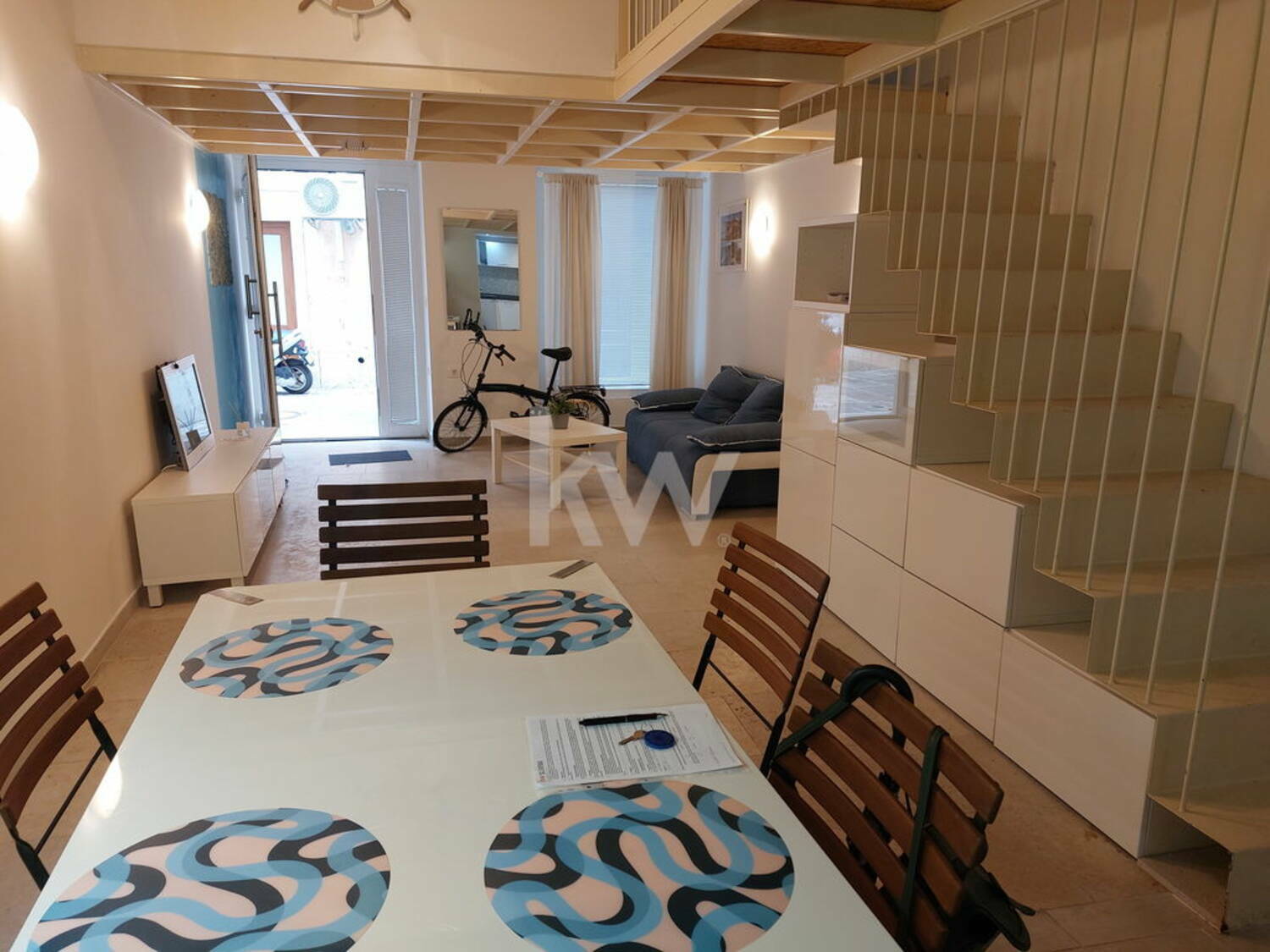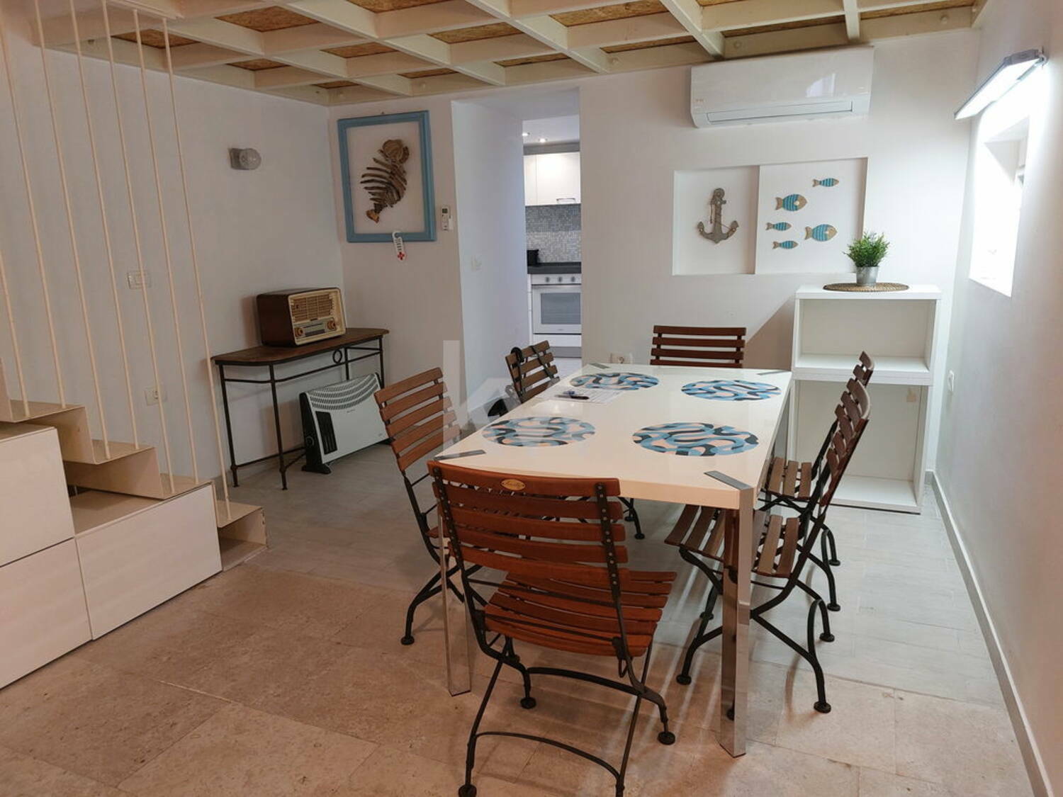 Stanovanje obsega odprto dnevno-bivalno kuhinjo, kopalnico ter dostop do medetaže po notranjih stopnicah.