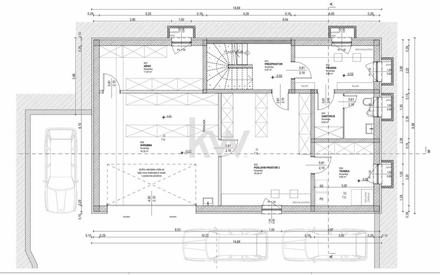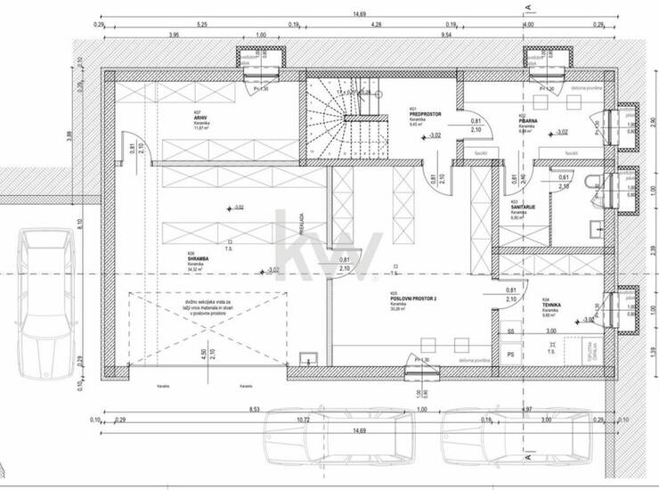 Pritličje/klet: servisni prostori, idealni za poslovno dejavnost (pisarna, studio, delavnica ipd.)