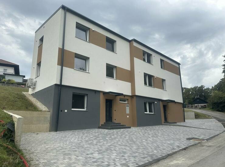 Stanovanjski objekt - leva enota ima skupno površino 186,35m², od tega 170,60 m² uporabne površine, zemljišča cca 700 m2, ki pripada enoti. Premišljena razporeditev prostorov omogoča udobno bivanje na treh etažah. Ob prihodu vas pričaka prostorno parkirišče za vsaj štiri avtomobile, od koder vstopite skozi vhodna vrata na hodnik. Iz hodnika je dostop do pisarne, kopalnice, tehničnega prostora in spalnice. Stopnišče vodi v prvo nadstropje, kjer se desno nahaja prostorna kuhinja z jedilnico, levo pa velika dnevna soba z izhodom na teraso. Zadnje nadstropje obsega dve veliki otroški sobi in dodatno kopalnico.