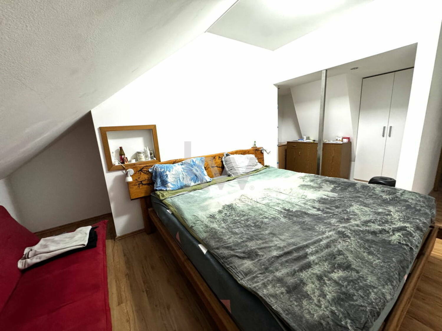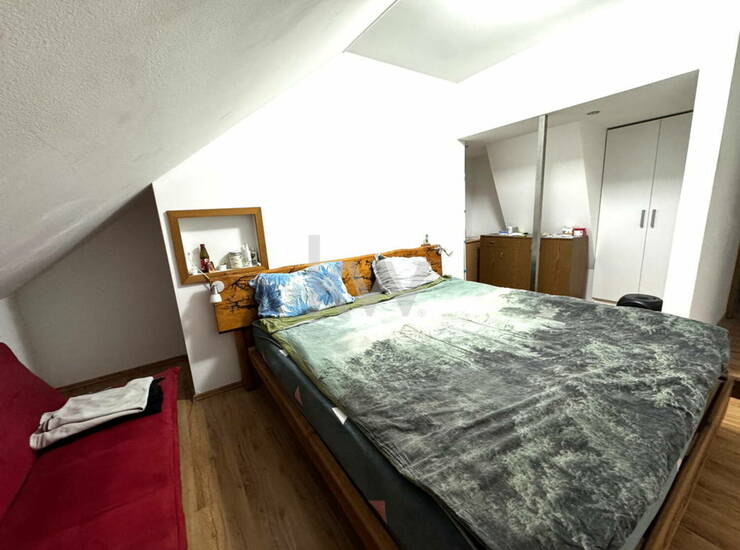 Po notranjem stopnišču se povzpnete v zgornjo mansardno spalnico, ki ponuja dodatno zasebnost ali ustvarjalni kotiček.