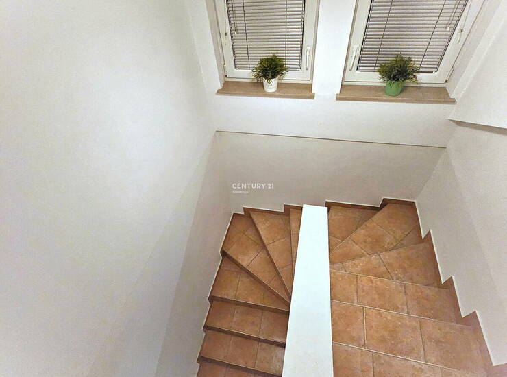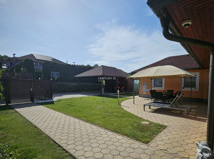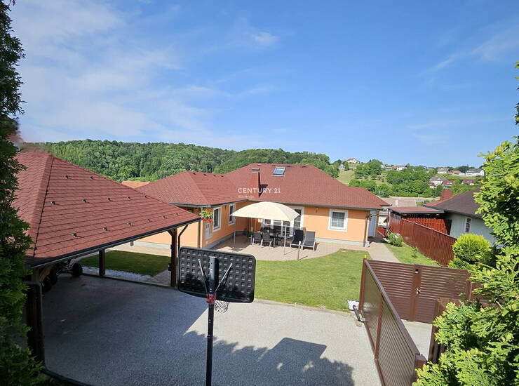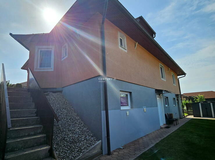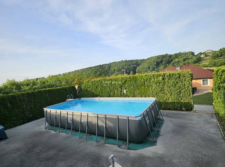 Posredujemo pri prodaji velike samostojne hiše v mirnem naselju v Šentilju v Slovenskih goricah. Hiša je bila grajena leta 2005 in obsega klet, pritličje ter mansardo. Skupna uporabna površina hiše je 199m2. Ograjeno zemljišče je velikosti 799m2 in se nahaja v mirnem naselju družinskih hiš. Gre za zadnjo hišo v slepi ulici, kar pripomore k še večji zasebnosti in miru. Ob glavnem objektu je lesen nadstrešek za dva avtomobila z drvarnico/vrtno lopo. Dovozna pot za avtomobile in poti okoli hiše so tlakovane in lepo urejene. Nekaj korakov stran od hiše je postavljen večji samostoječi bazen. Ob bazenu so visoke ciprese, ki vam omogočajo zasebnost. Ker bazen stoji na stavbnem zemljišču lahko namesto bazena zgradimo tudi manjši večnamenski objekt. Izhod iz dnevnega prostora nas vodi na lepo urejeno tlakovano teraso s paviljonom. Hiša obsega: Klet (40 m2): kurilnica z zunanjim vhodom, ločen WC, večnamenski prostor z zunanjim vhodom. Pritličje (106 m2): velika kuhinja z jedilnico in dnevno sobo (kamin, klima, panoramske stene, izhod na teraso), 3 velike sobe, kopalnica, garderoba/kabinet, stopnišče. Mansarda (41 m2): večja soba, ki se lahko preureditev v dodatno sobo, fitnes. Klima. Hiša je zelo kakovostne gradnje ter redno vzdrževana. Ima troslojno PVC stavbno pohištvo in kakovostno fasado z izolacijo. Strešna kritina je tegola. Hiša ima centralno ogrevanje ne olje. Možnost preklopa na trda goriva. V kombinaciji s kaminom v dnevni sobi ter inverter klima napravami so stroški ogrevanja in hlajenja za tako veliko hišo relativno majhni. Poskrbljeno je tudi za varnost, saj ima objket video nadzor okolice ter sodobnejši alarmni sistem, ki zazna vsak manjši premik v okolici hiše. Pohištvo in oprema je višjega cenovnega razreda in je vključena v ceno. Razen sedežna garnitura ter kuhinjski stoli. Lokacija: V neposredni bližini: vrtec, šola, trgovine, lekarna, ZD, pošta in rekreacijske površine... Um