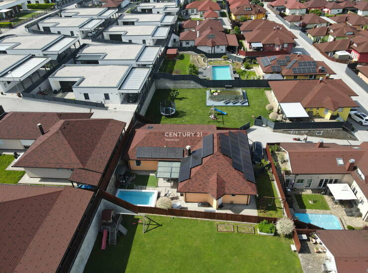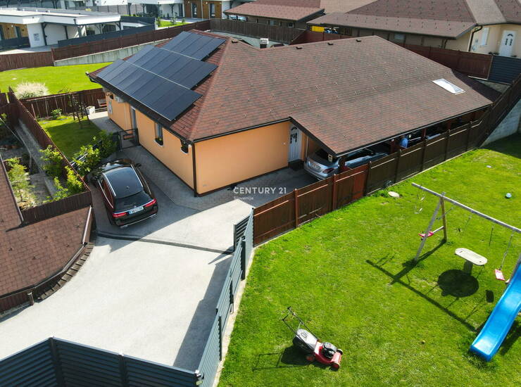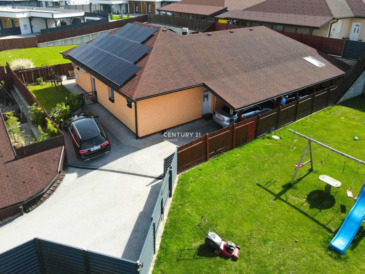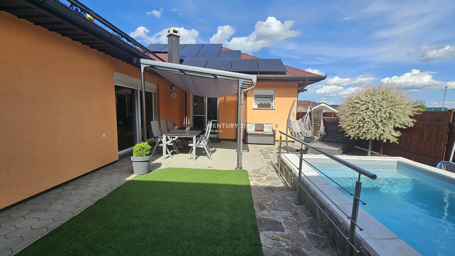 Šentilj; prodamo pritlično atrijsko hišo z ločeno garsonjero s svojim vhodom in zelenico za namen oddajanja airbnb ali starše, otroke, zunanje najemnike. STAVBA in tehnični podatki: Hiša je bila grajena l. 2016, l. 2022 pa dograjen bazen in urejena mejna škarpa. Po podatkih GURS hiša meri 125,5 m2 neto tlorisne površine, oz. 114,8 m2 uporabnih površin vse skupaj na 422 m2 parcele. Montažna gradnja z zunanjimi stenami izoliranimi v montažnih elementih z 8 cm kamene volne in dodatno 15 cm toplotno izolacijo. Strop je izoliran s 25 cm kamene volne. Stavbno pohištvo PVC termopan z roletami. Ogrevanje je urejeno nizkotemperaturno (talno gretje) s toplotno črpalko zrak-voda, s katero se ogreva tudi sanitarna voda in bazen. Hlajenje s klimatsko napravo. Po tleh je položena kvalitetna keramika. V hiši so vsi potrebni priključki. Parkiranje je urejeno z nadstreškom za dva avtomobila in dodaten parkirni prostor ob ločeni stanovanjski enoti. Rasporeditev prostorov: Garsonjera: Pred glavnim vhodom v hišo je ločena stanovanjska enota za ograjeno zelenico, ki spada le k tej enoti in kjer je tudi ločen vhod. Namenjena je za kratkoročno (ali trajno) oddajanje v najem. Predsoba s hodnikom, kjer bi se po potrebi dalo urediti manjšo priročno kuhinjo in kjer je možno tudi ponovno usposobiti povezavo s preostalo hišo. Prostorna kopalnica z wcjem, kopalno kadjo, tušem in dvojnim umivalnikom. Spalnica z izhodom na vrt, oz. teraso. Za ločitev dvorišča so na ograji nameščena vrata, ki gostom zagotavljajo mir in intimo. Stanovanjska hiša: Vhod s predsobo. Desno je tehnični prostor v kateri je toplotna črpalka z zalogovnikom in pralnica. Takoj levo se nahaja glavna spalnica z garderobno sobo. Glavni prostor je velik dnevno bivalni prostor razporejen v obliko črke L, kjer je v enem kraku kuhinja in jedilnica in v drugem prostorni dnevni prostor in v sredini te sobe je nameščena kaminska peč za ugodje poznojese