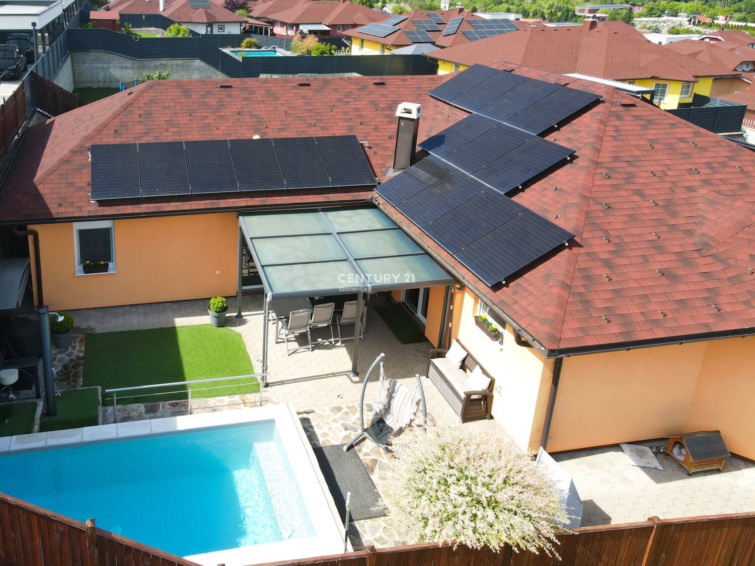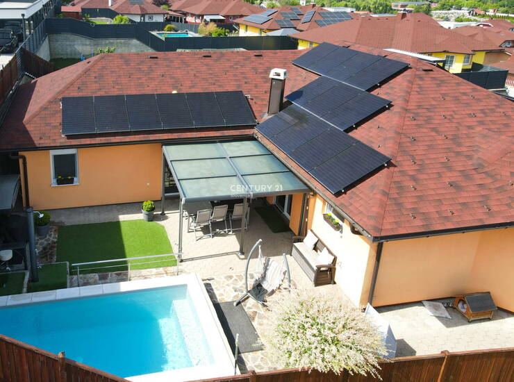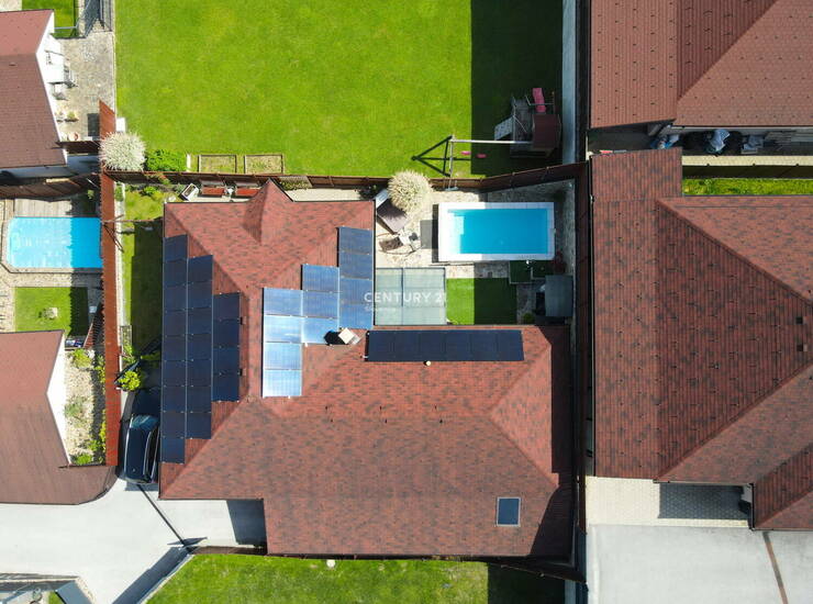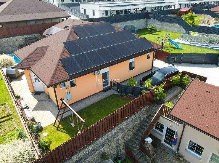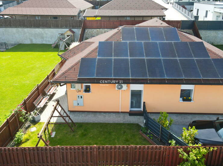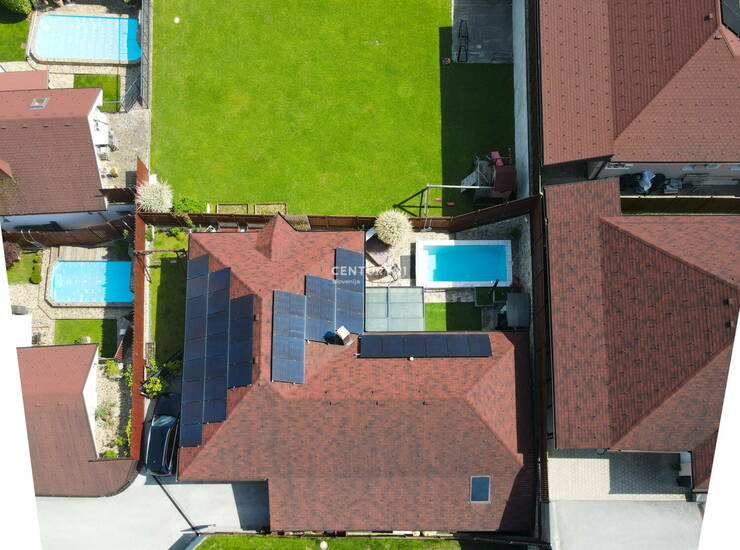 Šentilj; prodamo pritlično atrijsko hišo z ločeno garsonjero s svojim vhodom in zelenico za namen oddajanja airbnb ali starše, otroke, zunanje najemnike. STAVBA in tehnični podatki: Hiša je bila grajena l. 2016, l. 2022 pa dograjen bazen in urejena mejna škarpa. Po podatkih GURS hiša meri 125,5 m2 neto tlorisne površine, oz. 114,8 m2 uporabnih površin vse skupaj na 422 m2 parcele. Montažna gradnja z zunanjimi stenami izoliranimi v montažnih elementih z 8 cm kamene volne in dodatno 15 cm toplotno izolacijo. Strop je izoliran s 25 cm kamene volne. Stavbno pohištvo PVC termopan z roletami. Ogrevanje je urejeno nizkotemperaturno (talno gretje) s toplotno črpalko zrak-voda, s katero se ogreva tudi sanitarna voda in bazen. Hlajenje s klimatsko napravo. Po tleh je položena kvalitetna keramika. V hiši so vsi potrebni priključki. Parkiranje je urejeno z nadstreškom za dva avtomobila in dodaten parkirni prostor ob ločeni stanovanjski enoti. Rasporeditev prostorov: Garsonjera: Pred glavnim vhodom v hišo je ločena stanovanjska enota za ograjeno zelenico, ki spada le k tej enoti in kjer je tudi ločen vhod. Namenjena je za kratkoročno (ali trajno) oddajanje v najem. Predsoba s hodnikom, kjer bi se po potrebi dalo urediti manjšo priročno kuhinjo in kjer je možno tudi ponovno usposobiti povezavo s preostalo hišo. Prostorna kopalnica z wcjem, kopalno kadjo, tušem in dvojnim umivalnikom. Spalnica z izhodom na vrt, oz. teraso. Za ločitev dvorišča so na ograji nameščena vrata, ki gostom zagotavljajo mir in intimo. Stanovanjska hiša: Vhod s predsobo. Desno je tehnični prostor v kateri je toplotna črpalka z zalogovnikom in pralnica. Takoj levo se nahaja glavna spalnica z garderobno sobo. Glavni prostor je velik dnevno bivalni prostor razporejen v obliko črke L, kjer je v enem kraku kuhinja in jedilnica in v drugem prostorni dnevni prostor in v sredini te sobe je nameščena kaminska peč za ugodje poznojese