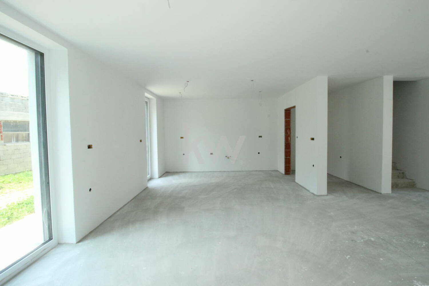 odprt, svetel dnevni prostor s kuhinjo in jedilnico ter izhodom na teraso