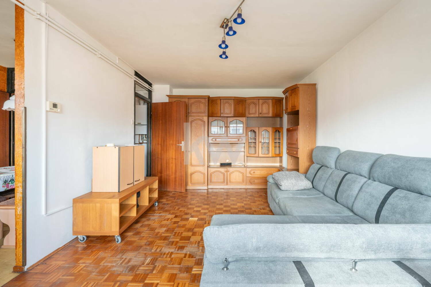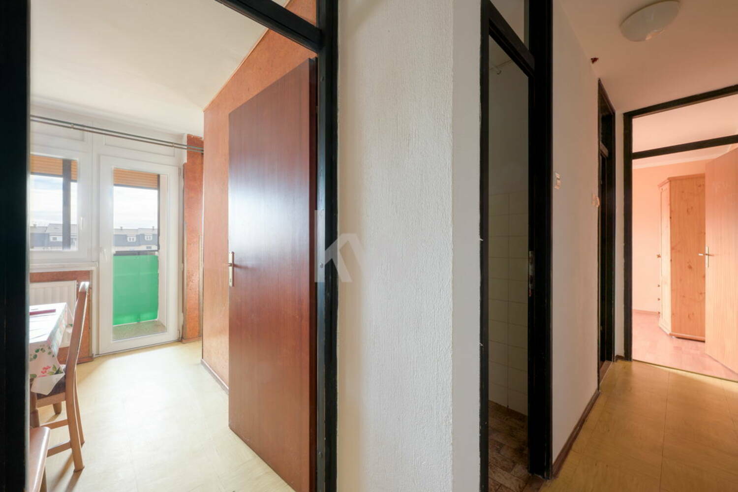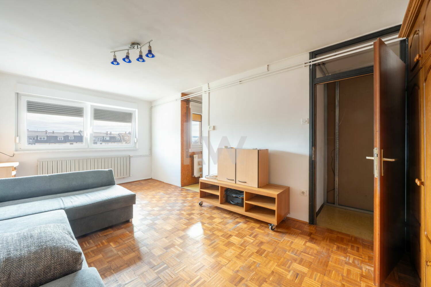 Bivalni del obsega prostorno dnevno sobo z jedilnim kotičkom, ki omogoča prijeten in svetel prostor za bivanje. Poleg tega stanovanje vključuje več manjših pomožnih prostorov, primernih za shrambo ali garderobo, ter zaprt balkon (več na sliki tlorisa).