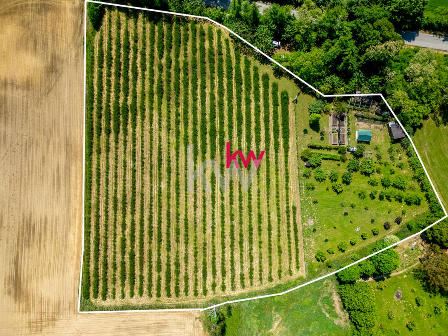 Vrt je v celoti pokrit z mrežo proti toči. Parcela je v celoti urejena z dovozom in večjim parkirnim prostorom ob asfaltni cesti. Na parceli je studenec v katerem je zmeraj dovolj vode za zalivanje in namakanje celotne parcele. Ob leseni brunarici je velika terasa s kaminom in krušno pečjo za piknike.