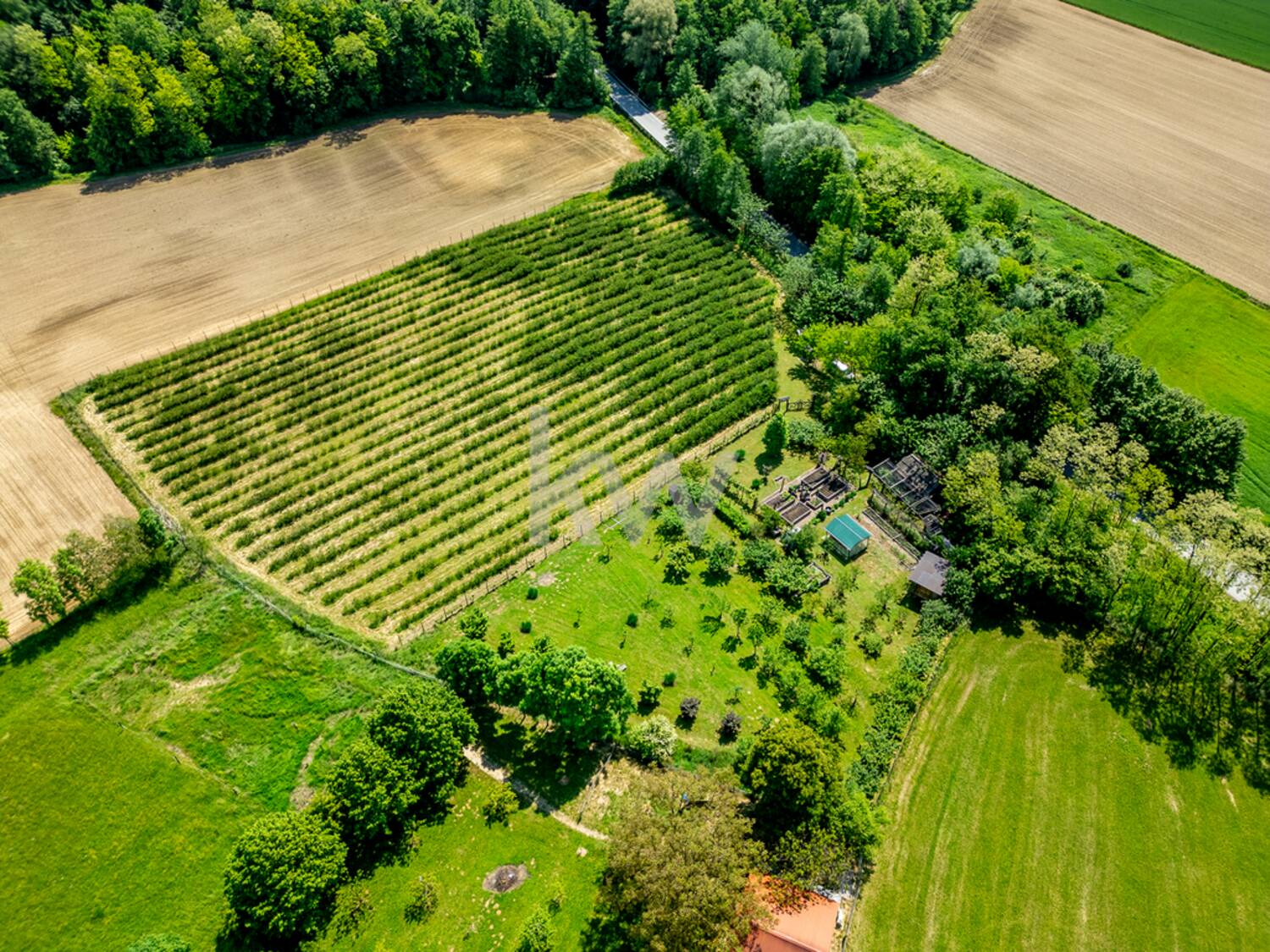 Na zemljišču je urejen zelenjavni vrt in 1ha urejenega nasada aronije (pridobljen certifikat za ekološko pridelavo sokov) na ostalem delu je sadovnjak z vsemi vrstami sadnih dreves, lešniki, fige, maline, kivi, ameriške borovnice itd.