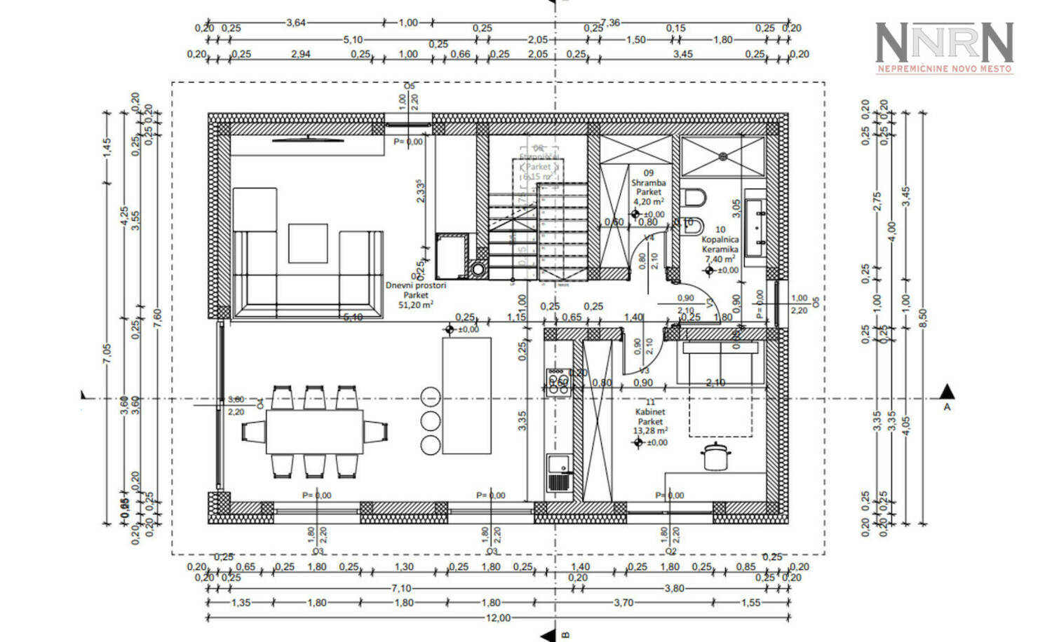 Pritličje: dnevni prostor (kuhinja, jedilnica in dnevna soba), shramba, kopalnica in soba (kabinet).