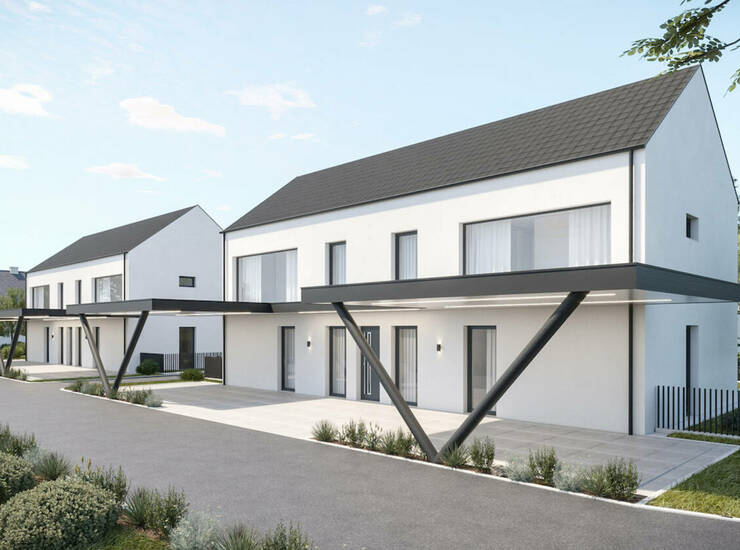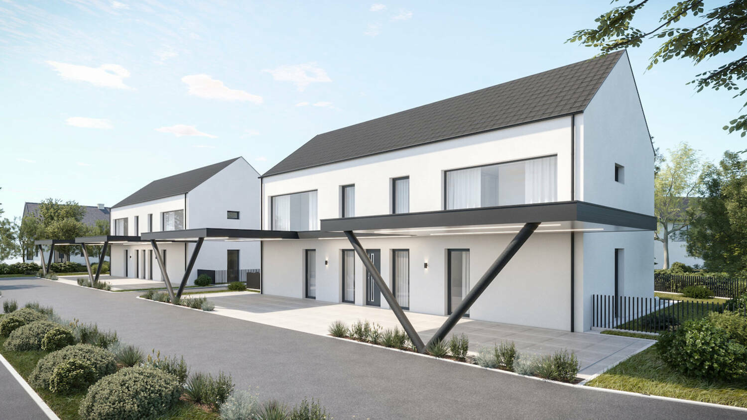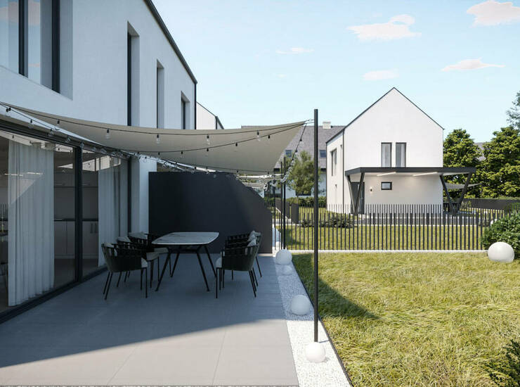 Stanovanjska enota obsega 145,47 m² bruto oziroma 109,57 m² bivalne površine, razporejene skozi tri etaže (P + N + M), in parcelo velikosti cca 270 m², kamor spadata zeleni atrij in 2 urejeni parkirni mesti pred objektom (možnost izvedbe nadstreška - slika render).