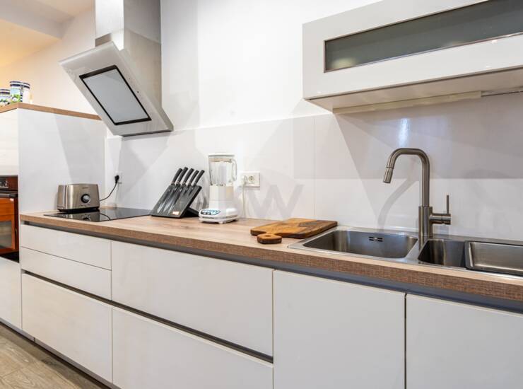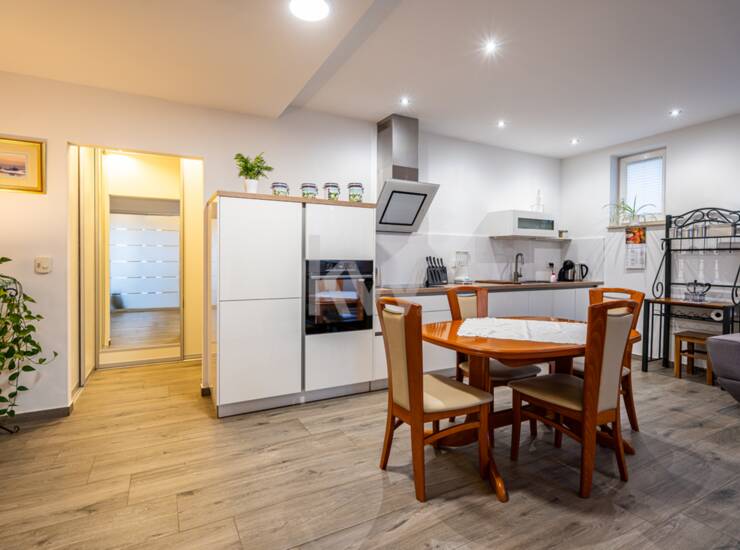 V pritličju še velika skupna kuhinja z jedilnico (~31 m²), izhod na zunanjo teraso, kjer je velika jedilna miza, letna kuhinja in žar – čudovito za druženje. V pritličju je dovolj prostora, da del njega uredite v pisarne ali drugo dejavnost.