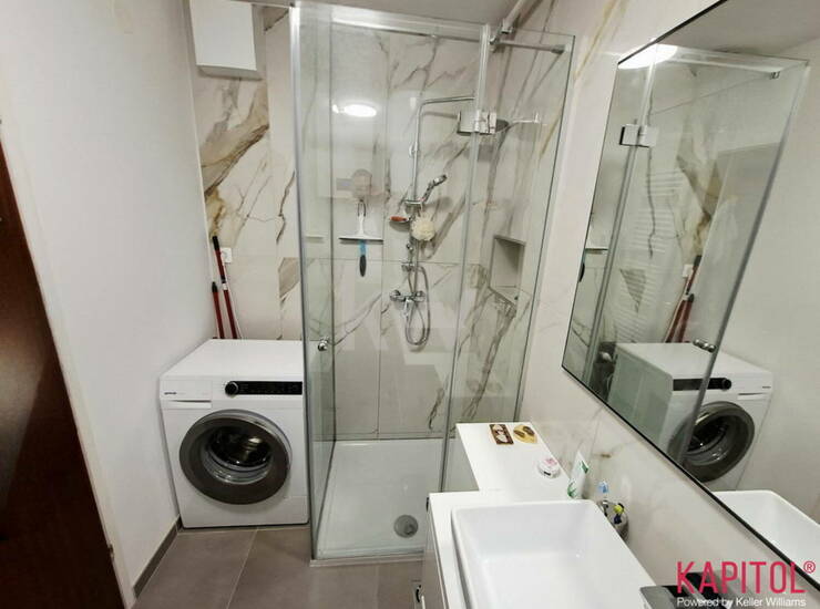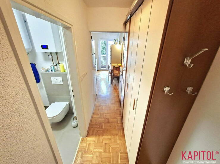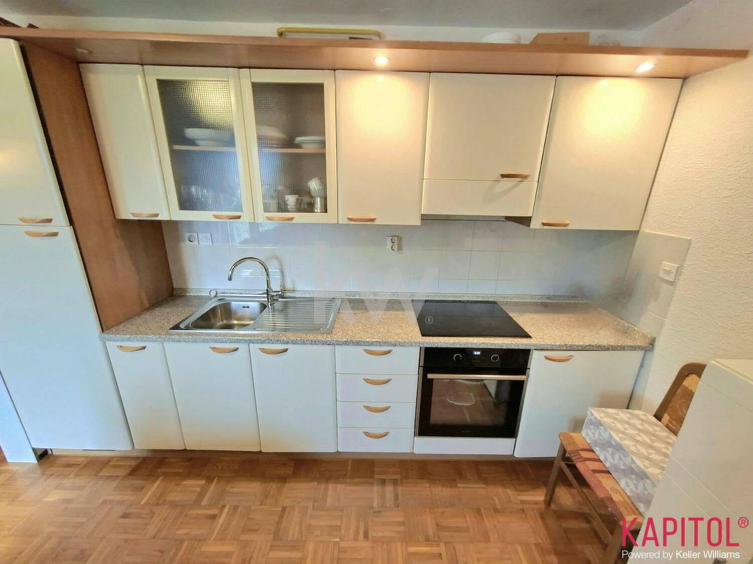 Stanovanje se prodaja opremljeno, razen: pralni stroj, hladilnik, televizija, in okrogla lesena mizica v dnevni sobi.